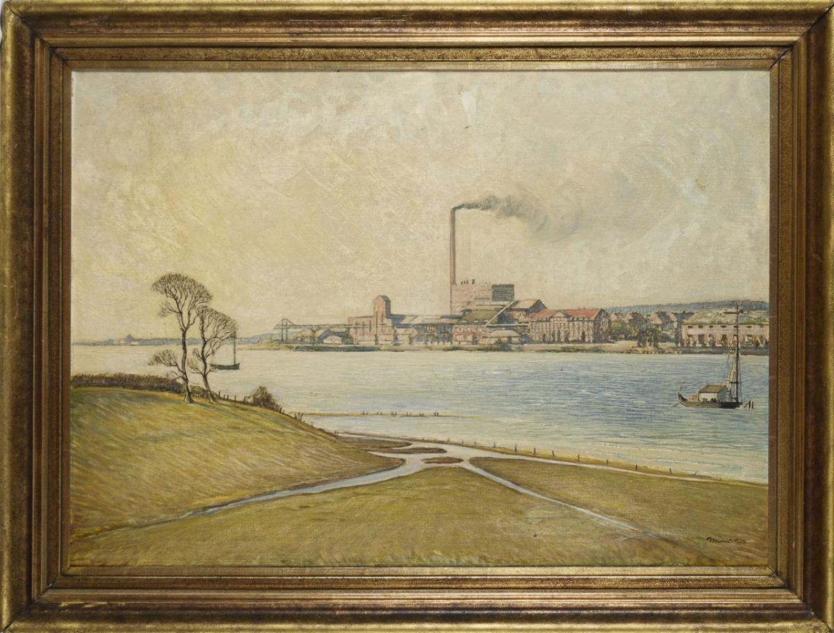 Große Industrieanlage an einem Fluss unter bedecktem Himmel. Eine restaurierte Stelle mit Hinterklebung.
