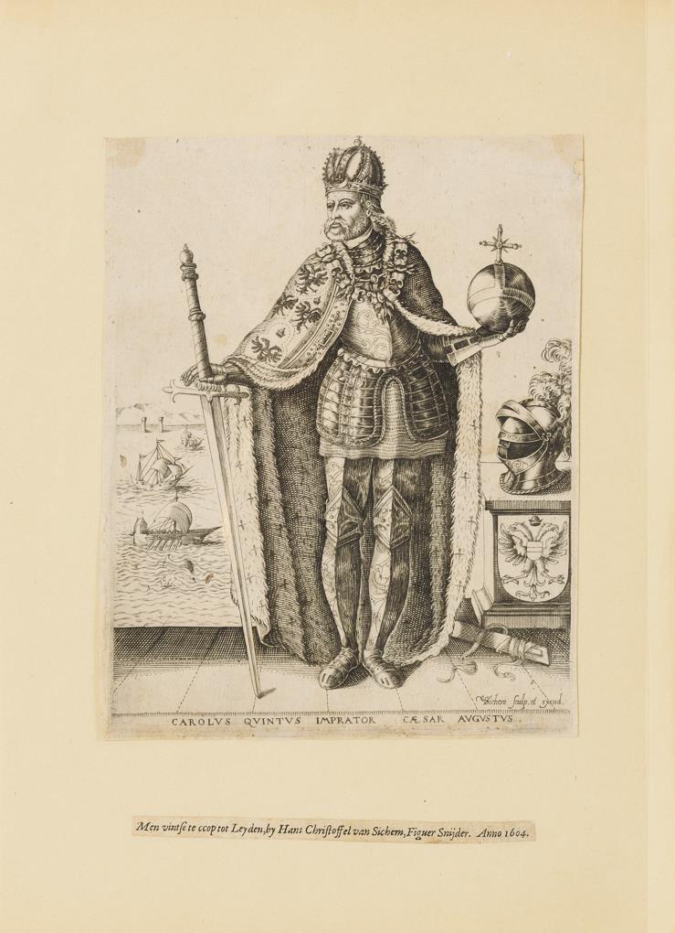 Ganzfiguriges Bildnis des Kaisers Karl V. von Habsburg (1500 - 1558) in Harnisch und Königsmantel, mit Reichskrone, Reichsschwert und Reichsapfel; aus einer Folge berühmter Persönlichkeiten um 1600. Blatt beschnitten und auf Papier geklebt, minimal verschmutzt, oben rechts mit kleiner, hinterlegter Fehlstelle.