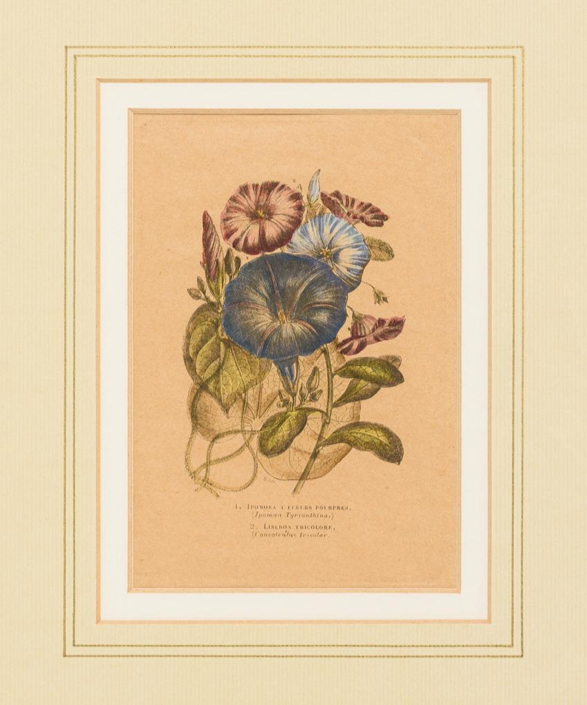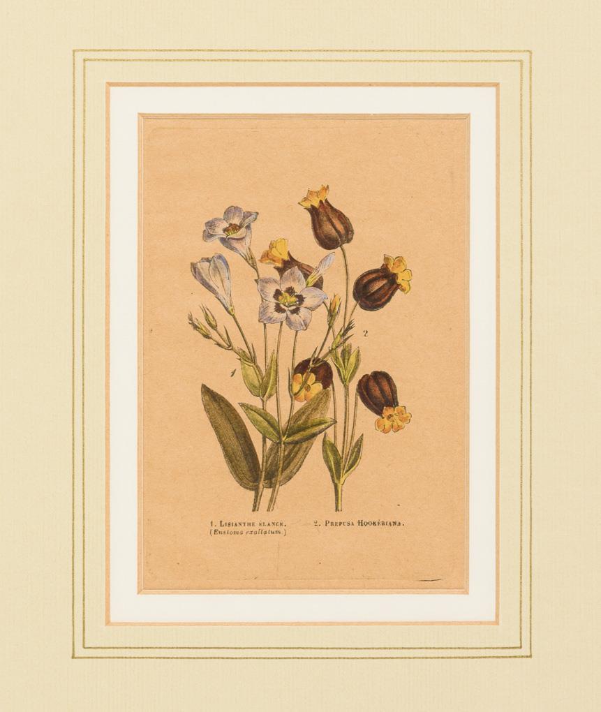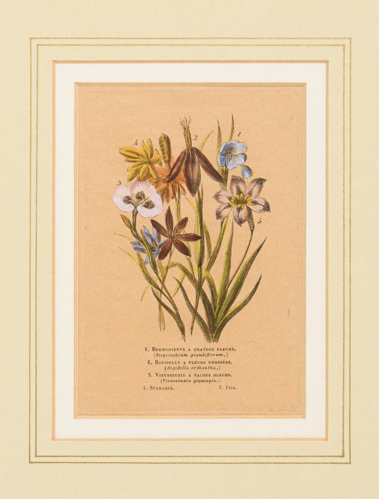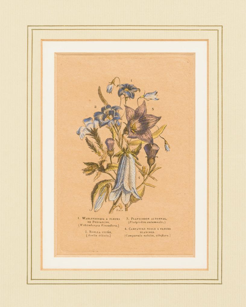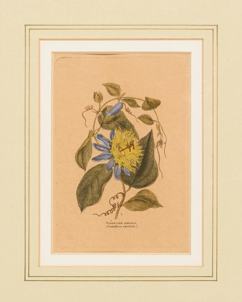 Passionsblume, Prärieglockenblume, Chinesische Glockenblume, Kamelie, Bermuda Zwergblume, Nebelwaldiris, Ballonblume und andere auf 6 Tafeln dargestellt; aus der botanischen Zeitschrift "Flore des serres et des jardins l'Europe", 1847; bezeichnet in Französisch und Latein.