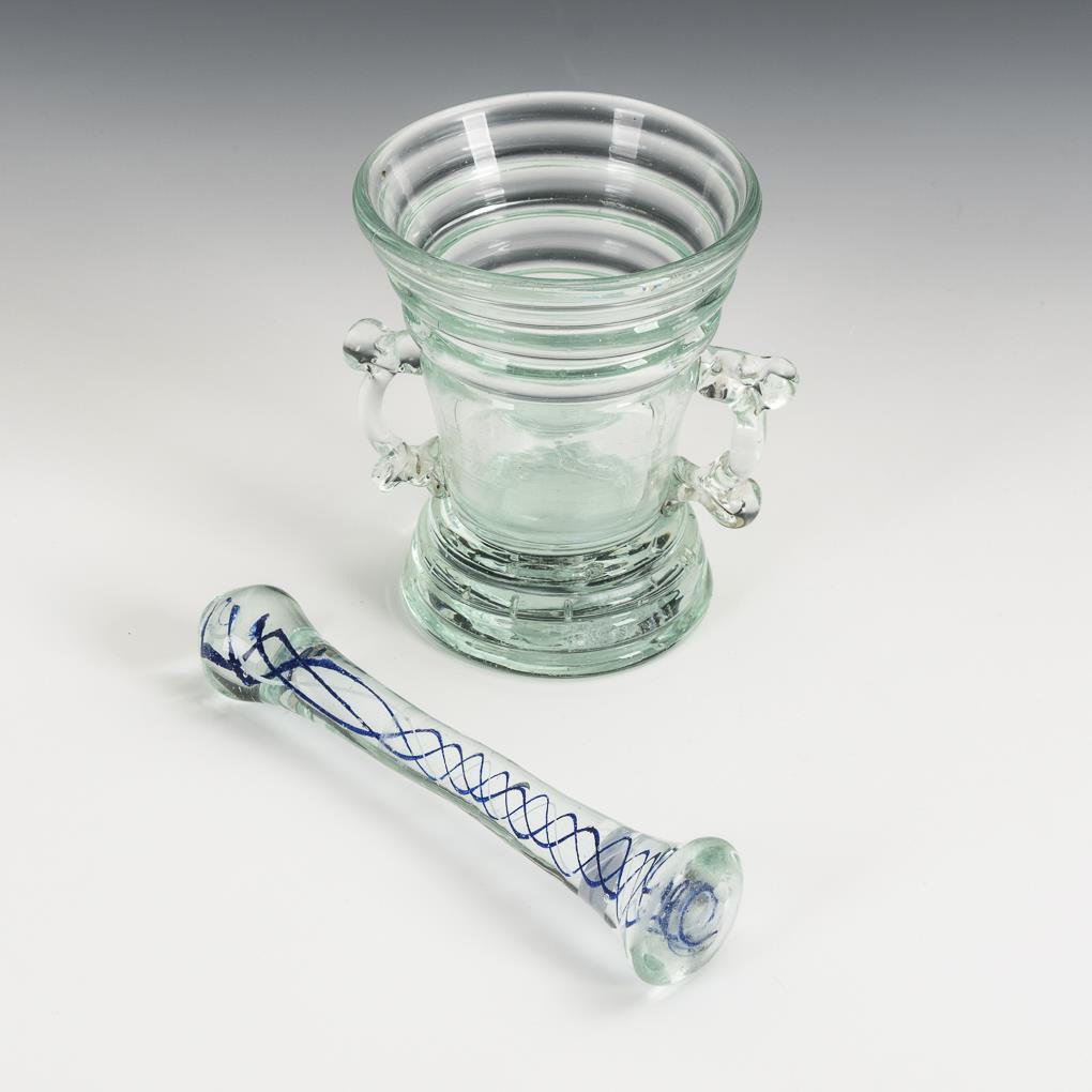 Farbloses Glas, Pistill mit eingeschmolzener Fadenspirale in Weiß und Blau. H Mörser 11,5 cm, L Pistill 16 cm.