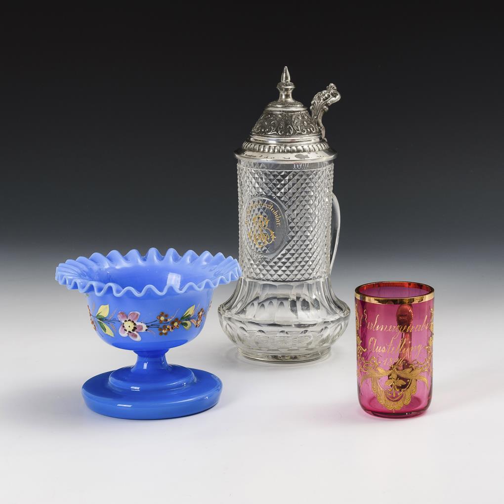 1x Bierkrug aus farblosem Glas mit Steinel- und Facettenschliff sowie Zinndeckel, schauseitig die Aufschrift "Hoch lebe der Jubilar BS" (H 22 cm). / 1x hellblaue, opalisierende Milchglasschale mit floraler Emailmalerei (H 10 cm). / 1x kleiner, rosalinfarbener Henkelbecher mit floraler Goldmalerei und der Aufschrift "Berlinergewerbe Ausstellung 1896.". Minimaler Goldabrieb.