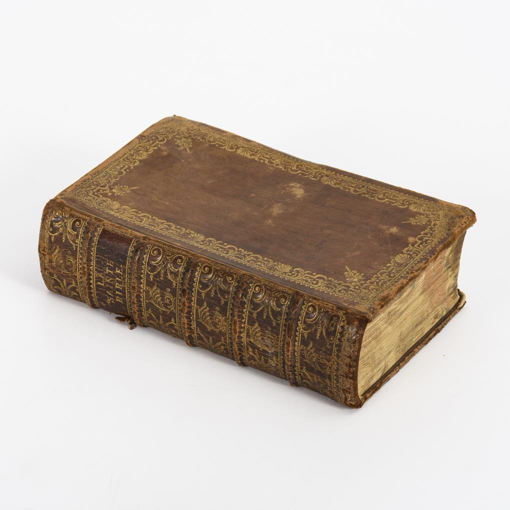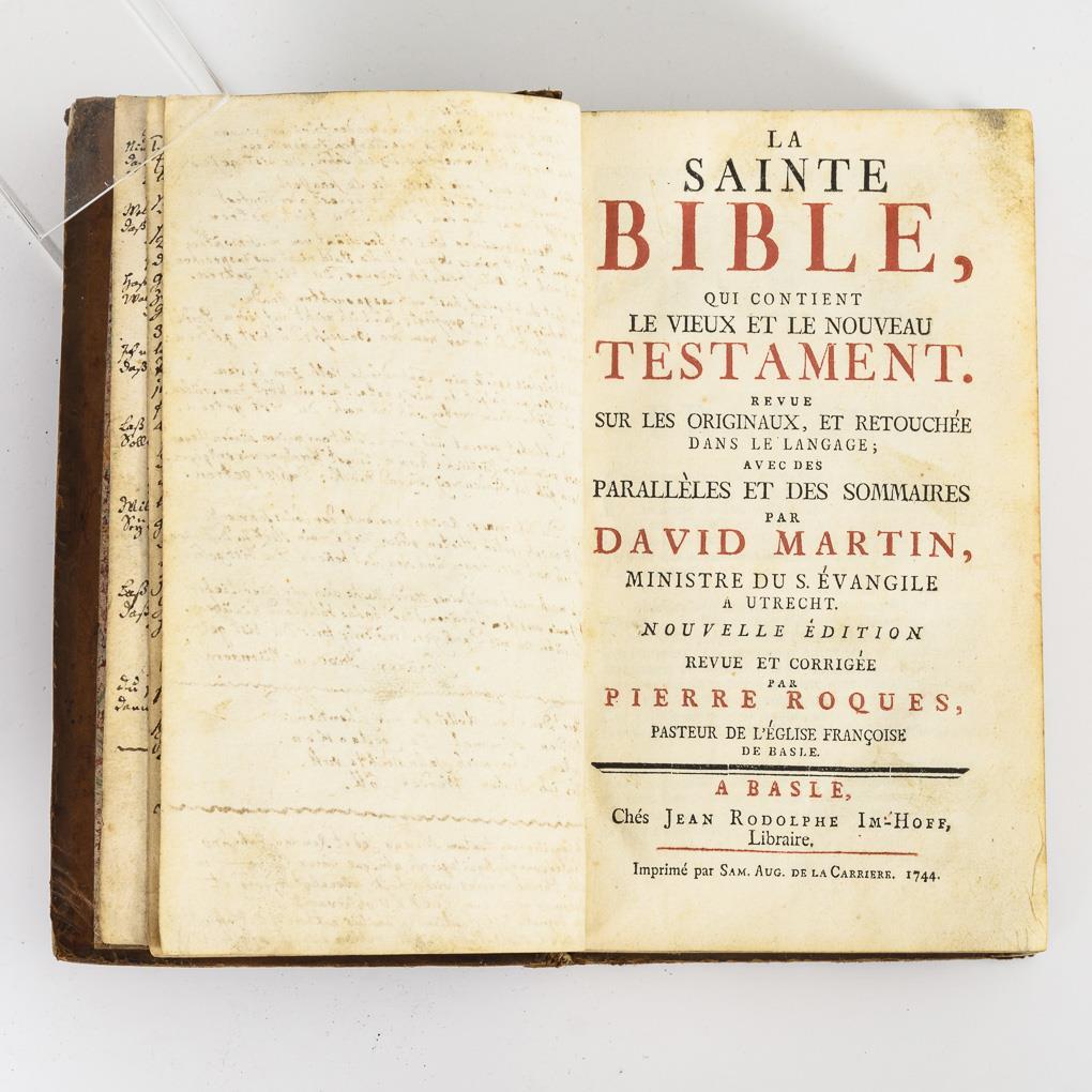 Bibel in französischer Sprache, 7 Blätter im Vor- und Nachsatz eng handschriftlich beschrieben. Goldgeprägter Ledereinband. Alters- und Gebrauchsspuren.