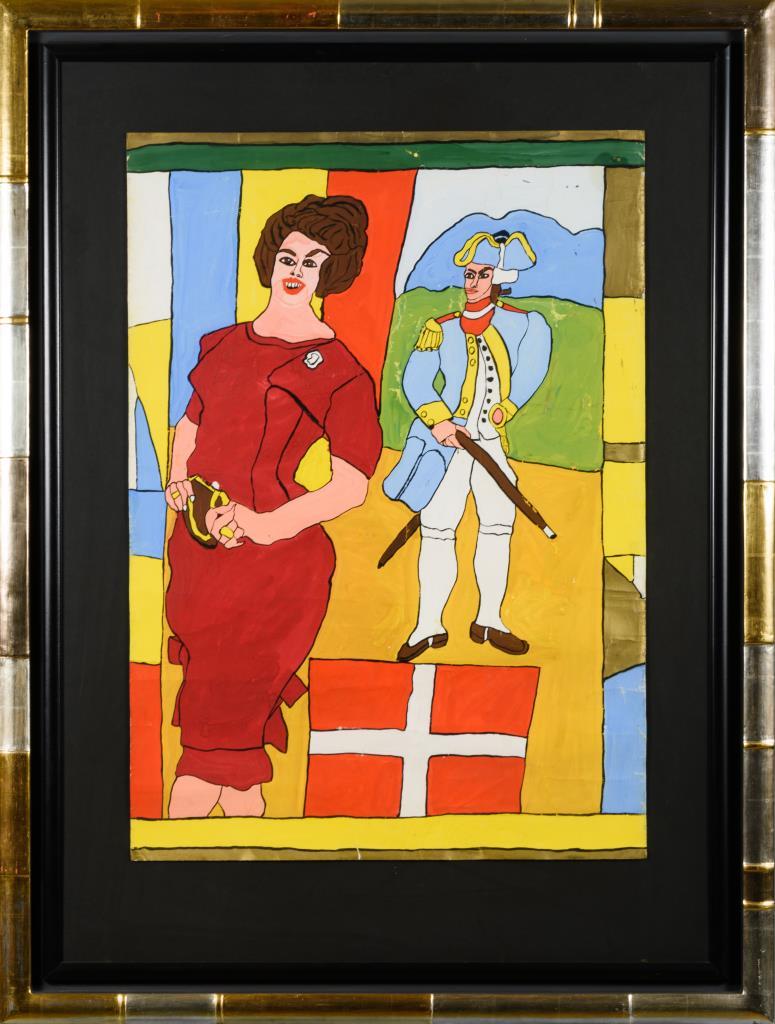 Bildnis der dänischen Königin im roten Kleid und einem Gefolgsmann. Leichte Altersspuren.