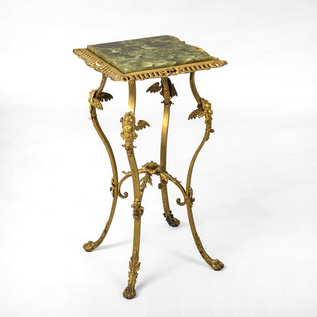 Quadratischer Blumentisch mit Onyx-Marmor-Platte, auf stiltypisch geschwungenem Messinggestell, verziert mit Akanthus, Tatzenfüßen und plastischen Kopf-Darstellungen des griechischen Gottes Hermes. Alters-/Gebrauchsspuren, Platte mit Kratzspuren und kleiner Ergänzung.