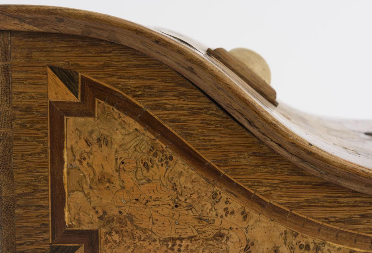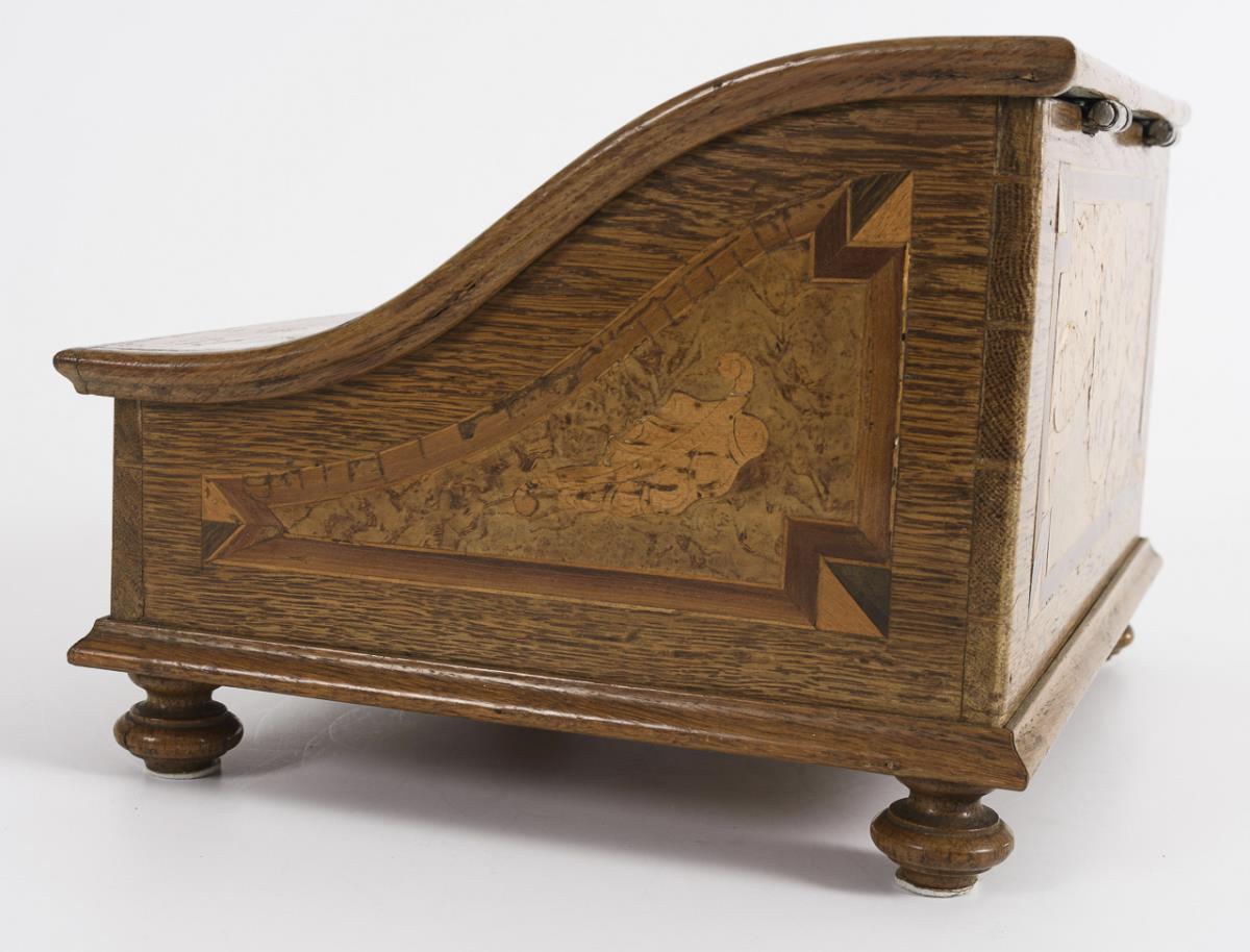 Auf gedrückten Kugelfüßen stehende Schatulle mit geschwungenem Scharnierdeckel. Allseits und auf dem Deckel marketierte Scheinkassetten; auf dem Deckel zusätzlich ein Nadelkissen. Innen verzierte Scharniere, 1 Schloss sowie eine Beilade. Einige Ergänzungen (z.B. das Schloss), Risse im Deckel, sonst einige wenige Alters-/Gebrauchsspuren.