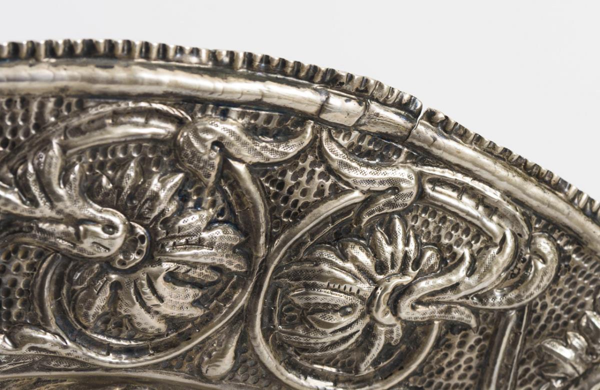 Reich reliefierter Teller mit Rankendekor. Profilansicht eines bärtigen Mannes mit antikisierendem Helm im gewölbten Spiegel. Kleine Defekte und Reparaturen am Rand.