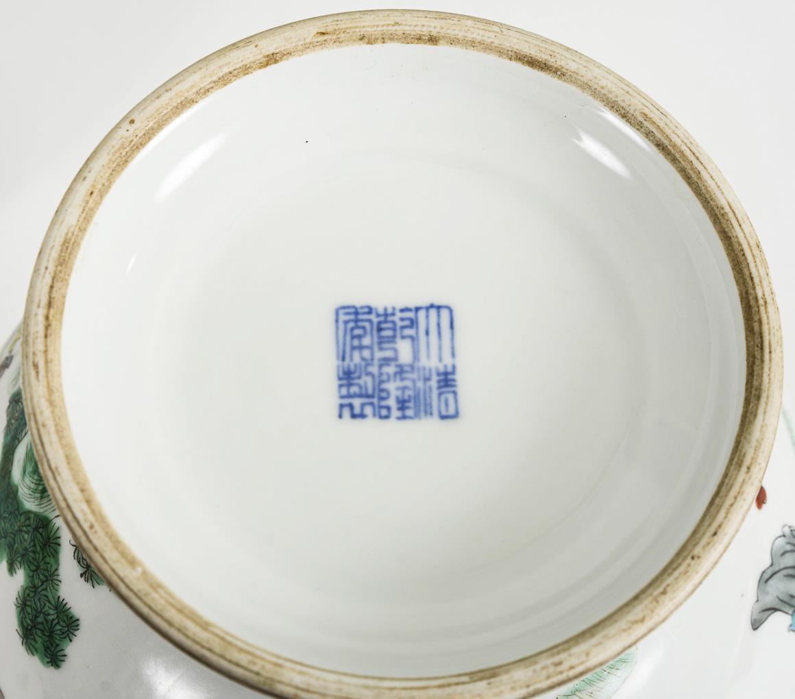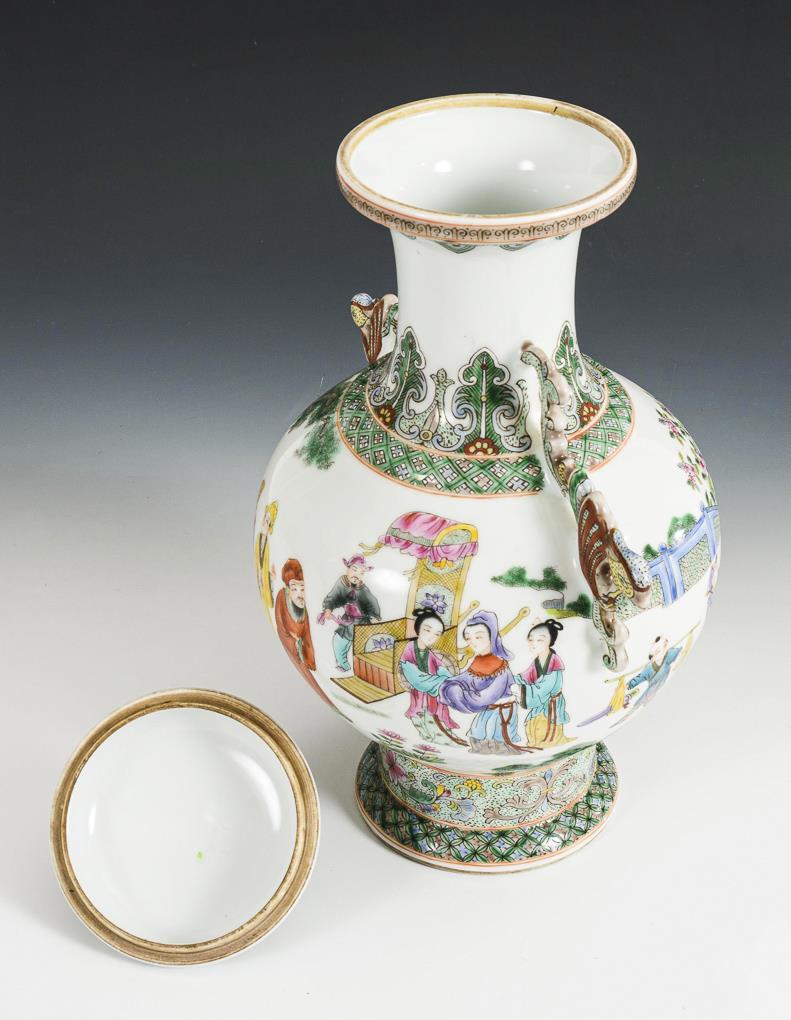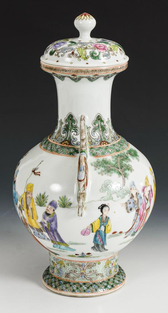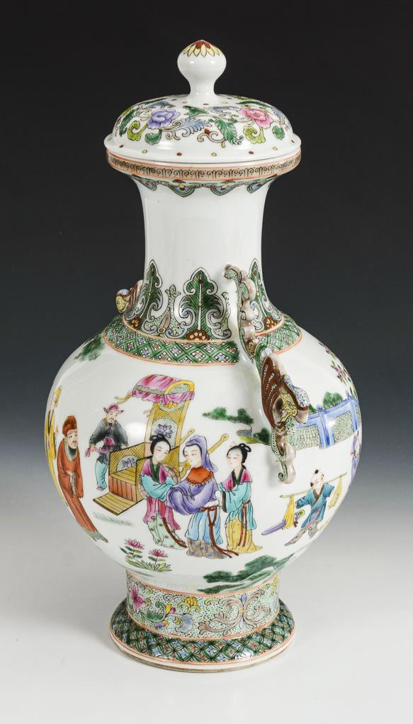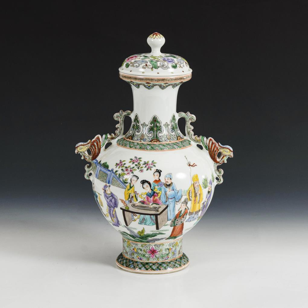 Bauchige Balusterform mit Handhaben in Form eines stilisierten Phönix. Auf Wandung umlaufend polychrome Figurenszenen.