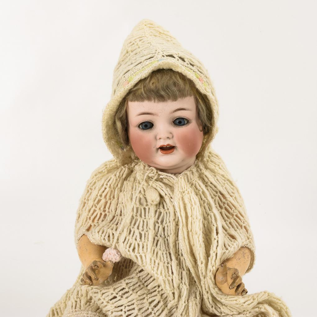 Kurbelkopf, blaue Schlafaugen, blonde Mohairperücke. 5-teiliger Sitzbabykörper. Weißes Häkelcape mit Kapuze, ergänzte weiße Babyschuhe, 1 Strumpf fehlt. Kopf durchleuchtet: ohne Defekte, lediglich leichter Perückenpull hinter dem rechten Ohr. Körper mit kleinen Defekten, 2 Finger fehlen.