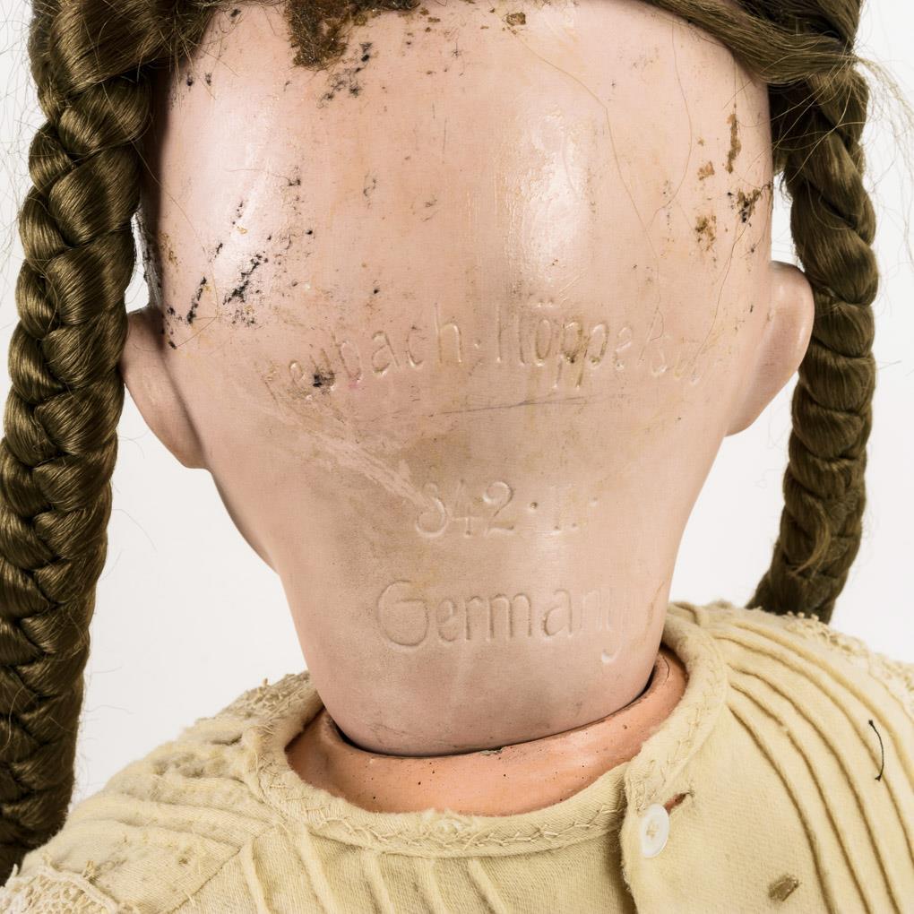 Kurbelkopf, braune Schlafaugen, braune Kunsthaar-Zopfperücke. 5-teiliger Stehpuppenkörper. Weißes Kleid mit Spitze. Kopf durchleuchtet: ohne Defekte, lediglich leichter Perückenpull an der Stirn. Körper mit Defekten.