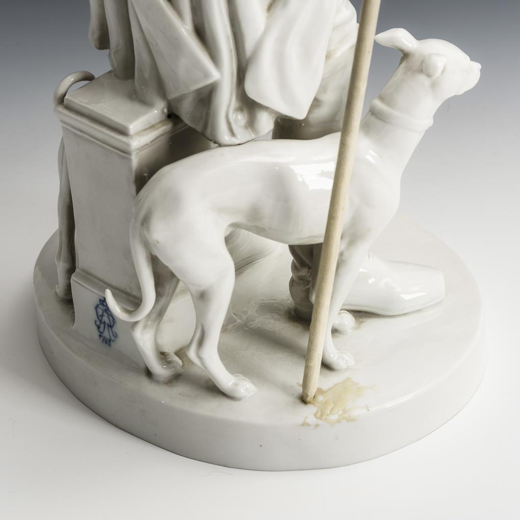 Stehende Figur des Preußenkönigs Friedrich II. mit zwei Windspielen an der Seite, nach der 1821/22 geschaffenen Statue des Bildhauers Johann Gottfried Schadow (1764-1850). Stock restauriert, Degengriff fehlt.
