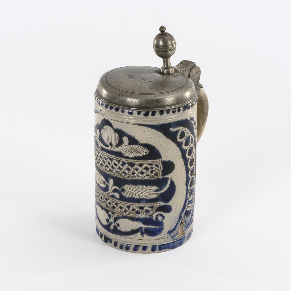 Zylinderkrug mit Ohrenhenkel. Schauseitig Blattornamente mit geflochtenen Dekorstreifen, flankiert von Spiralbändern. "J.N.A." gravierter Zinndeckel mit Kugeldrücker. Feiner Bodenriss, kleiner Wandungsabschlag, Deckel mit Defekten.