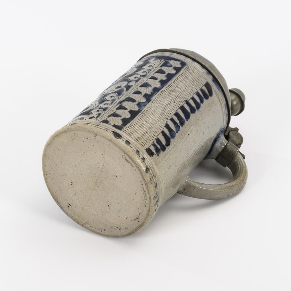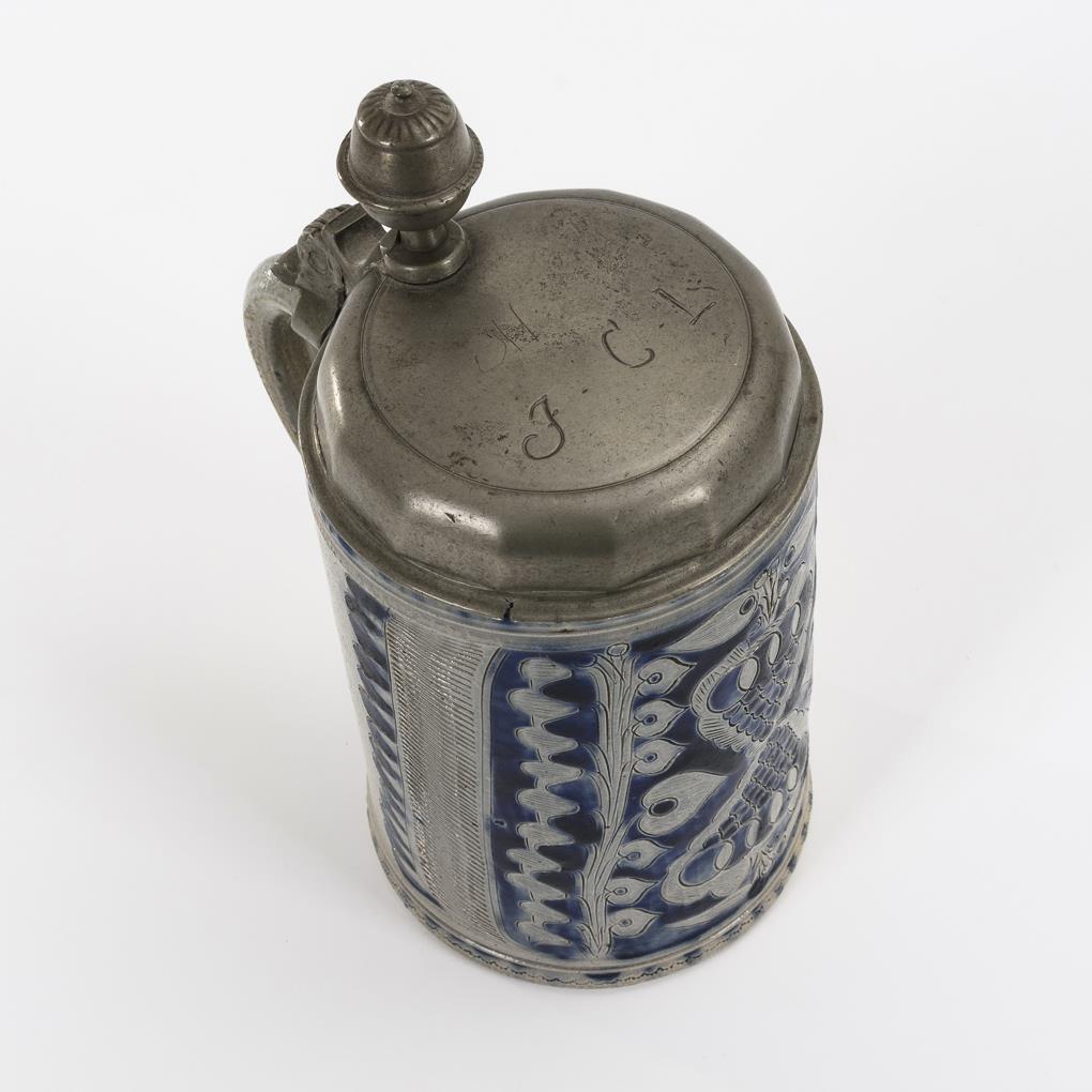 Zylinderkrug mit Ohrenhenkel. Schauseitig Fruchtdekor, flankiert von Blattstangen. "J.C.L." gravierter Zinndeckel mit Eicheldrücker. Feiner Bodenriss, Deckel gelockert und mit Defekten.