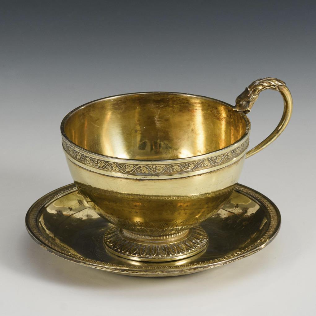 Klassizistische Tasse mit Zungenbändern und Rankenzier. Tellerchen passend als Untertasse. Teils gedellt, Vergoldung partiell etwas berieben.