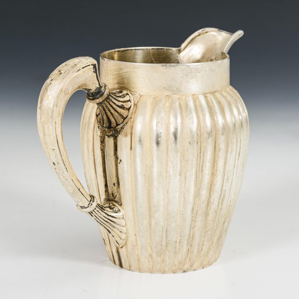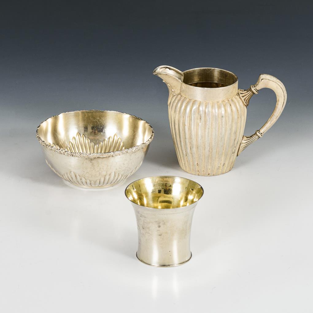Milchkännchen und Schälchen mit Rippenzier. Konischer Becher mit Monogrammgravur "A", innen vergoldet. Teils gedellt.