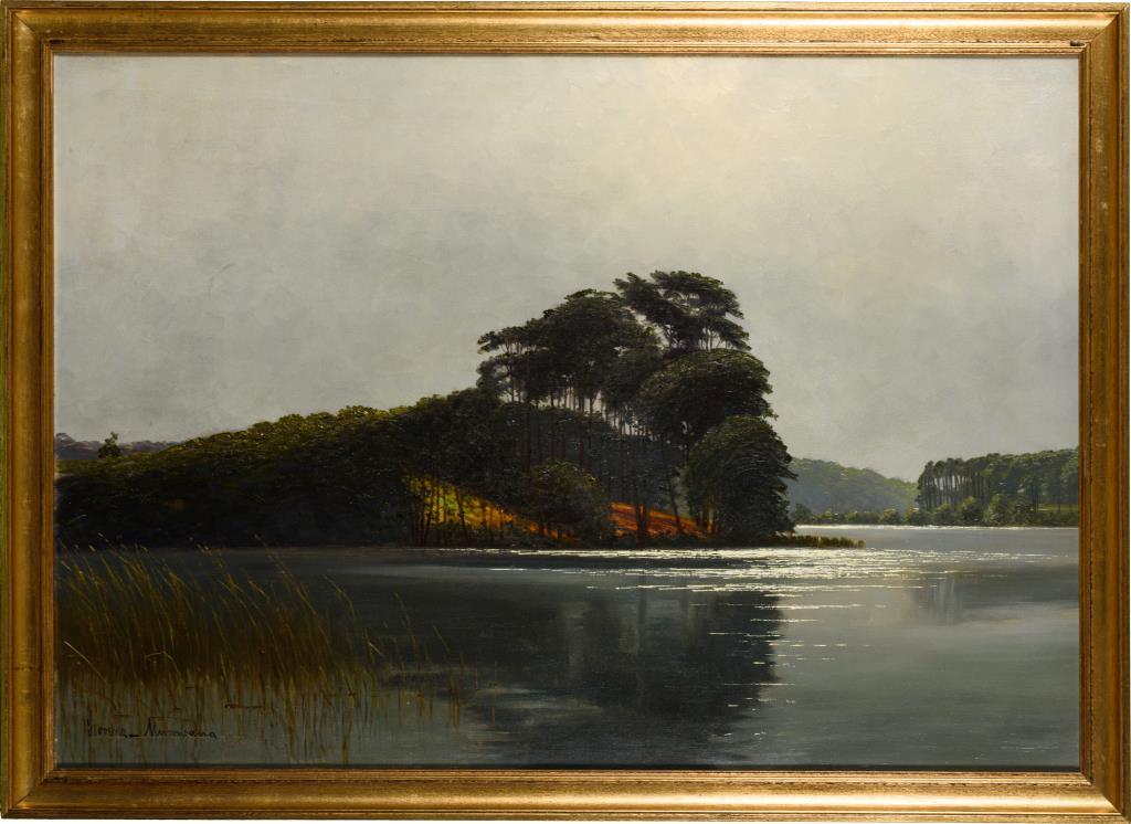 Lichtreflexe auf dem ruhigen See vor den hohen Kiefern. Minimale Altersspuren.