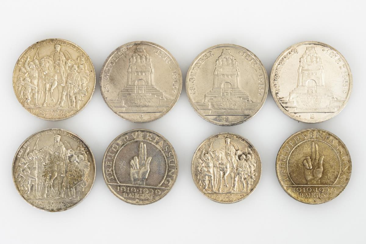 2x 3 Mark, 1918, "Der König rief und Alle, Alle kamen". / 2 Mark, dito. / 3x 3 Mark, 1913, Völkerschlachtdenkmal "18. Oktober 1813-1913". / 2x 3 Mark, "Hindenburg Reichspräsident", "Treu der Verfassung 1919 - 1929 11. August". Zustand: sehr schön bis vorzüglich, mit Patina.