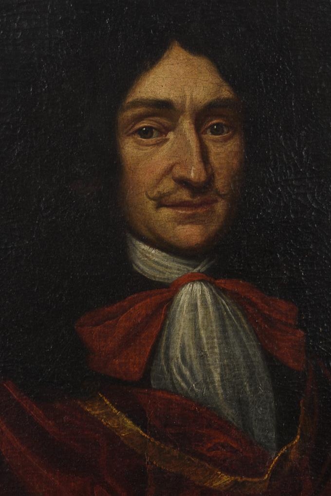 Porträt des Grafen in herrschaftlichem Gewand mit Allongeperücke und prunkvollem Harnisch. Restaurierungsbedürftig.