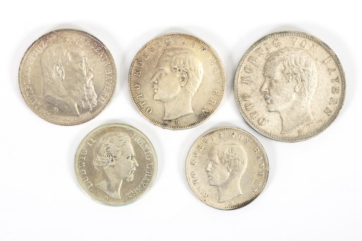 5 Mark, "Otto König von Bayern", 1903. / 3 Mark, dito, 1912. / 2 Mark, dito, 1903. / 3 Mark, "Luitpold Prinzregent v. Bayern", 1911. / 2 Mark, "Ludwig II. König v. Bayern", 1876. Zustand: sehr schön - vorzüglich.