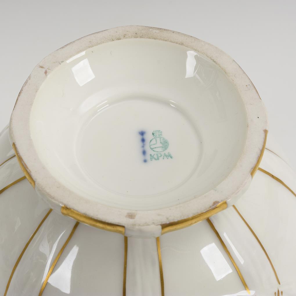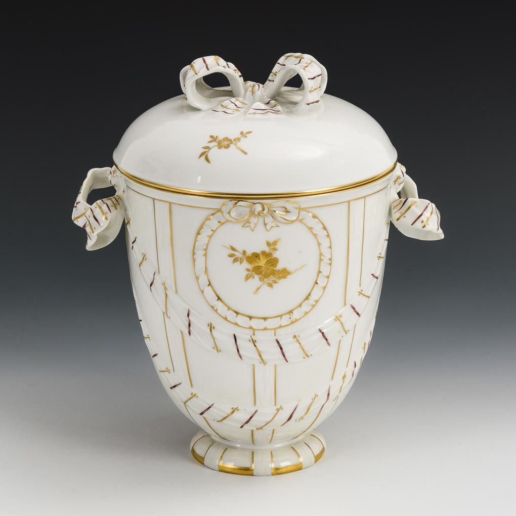 Ovoide Form mit zwei Bandschleifenhenkeln und Deckel mit Schleifenbekrönung. Goldradierte Blütenstängel sowie goldenes und gold-altrosafarbenes Streifenmuster.