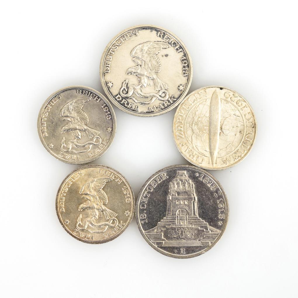 3 Mark, Völkerschlachtdenkmal "18. Oktober 1813 - 1913", 1913. / 3 Reichsmark, "Graf Zeppelin Weltflug 1929", 1930. / 3 Mark, "Der König rief und Alle, Alle kamen", 1913. / 2x 2 Mark, dito, 1913. Zustand: vorzüglich.