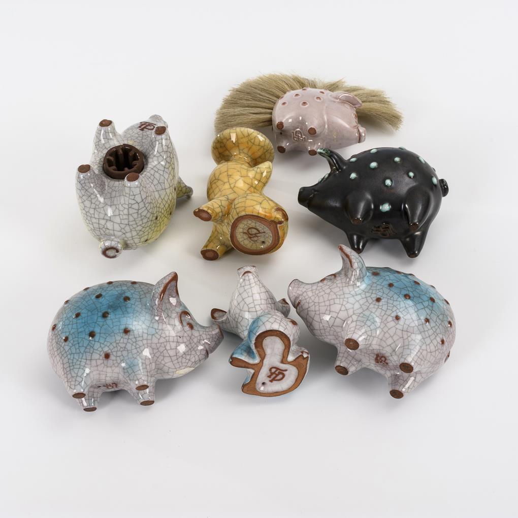 7 verschiedene Deko-Figuren, u.a. 1 Sparschwein, 1 Kerzenleuchter, 1 Bürstenschwein. 1 feiner Riss an Schwein mit Bürste.
