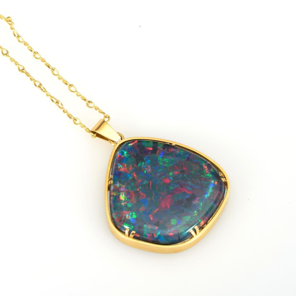 Große Triplette mit blau/rot/grünem Farbenspiel, in Zargenfassung. Ziergliederkette mit Verschlussknebel.