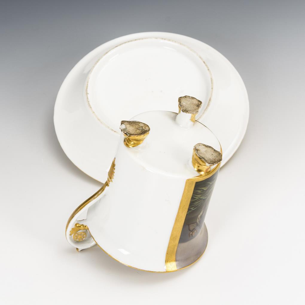 Zylindertasse mit Kraterrand, 3 Tatzenfüßen und Rosettenhenkel. Schauseitig auf der Tasse eine Rechteckkartusche mit der Darstellung eines ein Kind aus dem Wasser rettenden Bernhardiners. Im Spiegel der Untertasse die studentische Widmung "O. Rintelen s/m H. Pernice Bonn 1853.". Tatzenfüße bestoßen.
