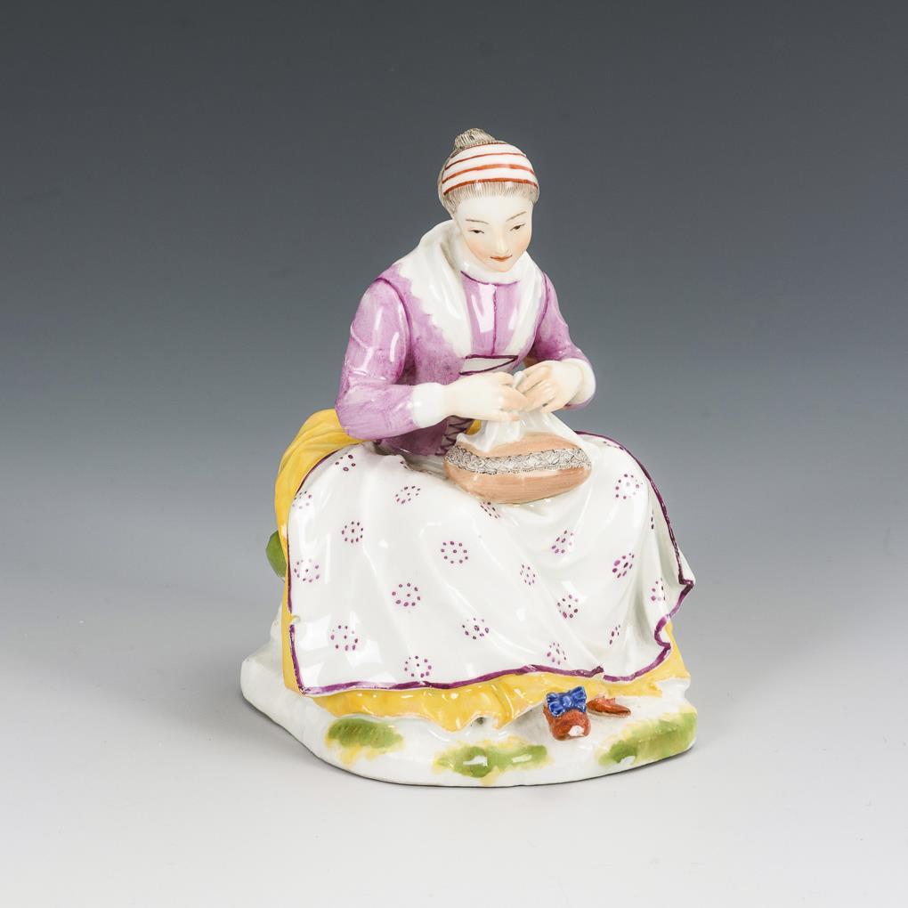 Sitzende junge, mit einer Handarbeit beschäftigte Frau. Bestoßung am Schürzensaum und an der rechten Fußspitze, partiell Glasurabplatzer.