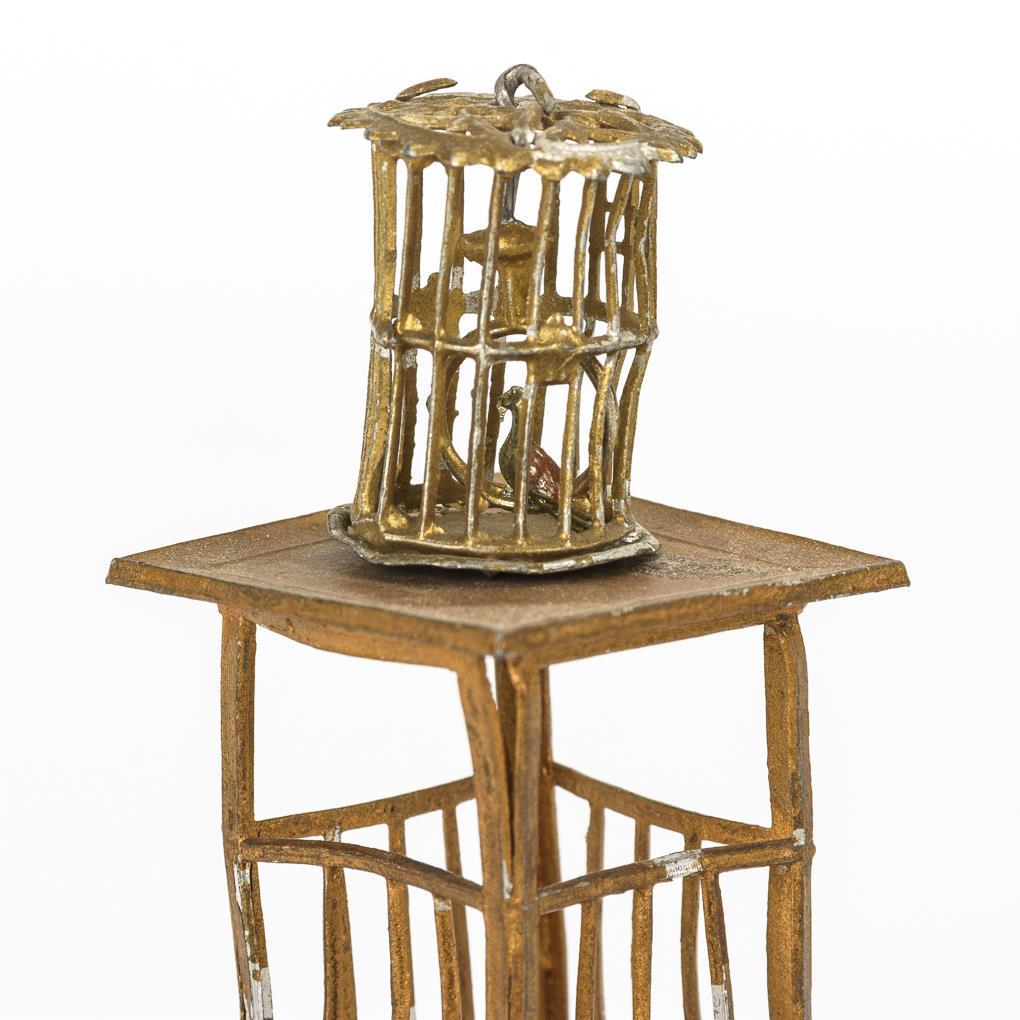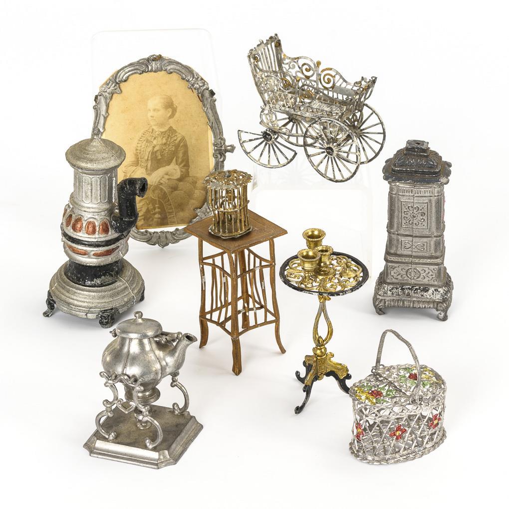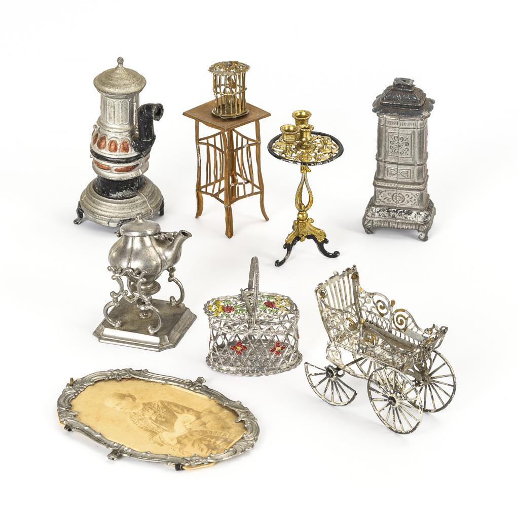 9 Teile: Seltener Kinderwagen, 2 Öfen, 2 Tischchen, Teekanne auf Rechaud, Vogelkäfig, Bilderrahmen und ovaler Korb. Altersspuren, teils mit Fehlstellen und kleinen Defekten (1 halbes Rad des Kinderwagens fehlt).