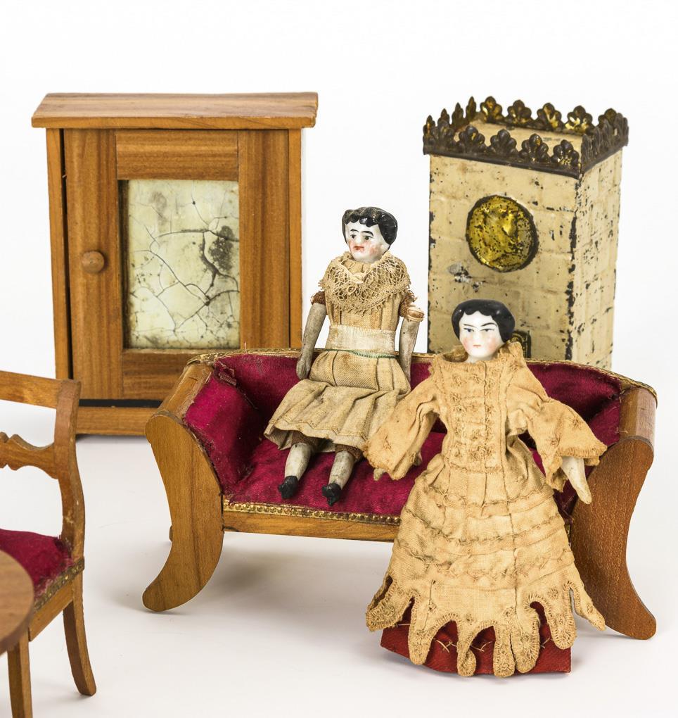 Salongarnitur im Biedermeier-Stil: Schrank, Sofa, runder Mittelfußtisch, 3 Stühle und Wandspiegel. Dazu weiß lackierter Kachelofen, Deckenleuchter, Wandleuchter und 2 Puppenstubenpuppen. Altersspuren, kleine Defekte.