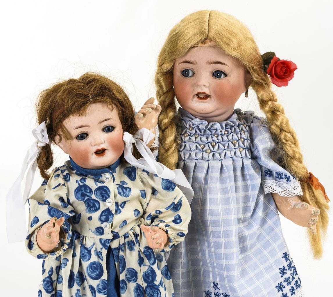 Beide mit Kurbelkopf, blauen Augen und 5-teiligem Babykörper. 1x mit Schlaf-/Schelmenaugen und blonder Kunsthaarperücke, 1x mit Schlafaugen und hellbrauner Perücke. Blau-weiße Kleider. Köpfe nicht durchleuchtet, 1x mit kleinen Chips an der Halskurbel. Beide bespielt, mit fehlenden Fingern.