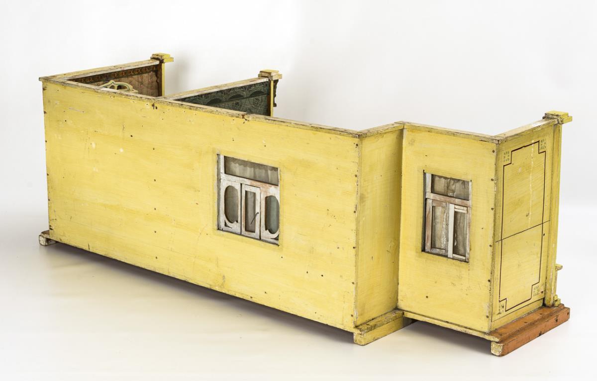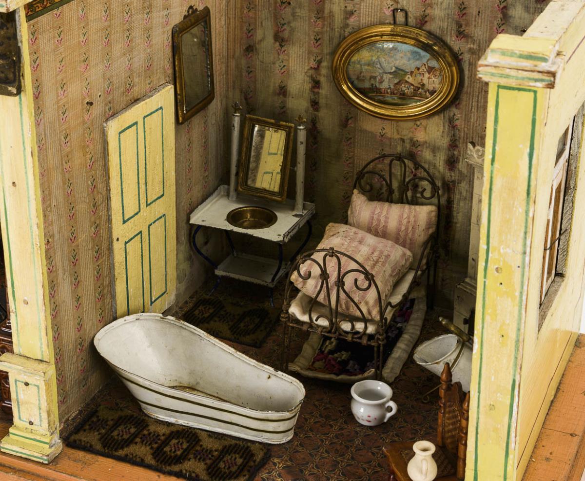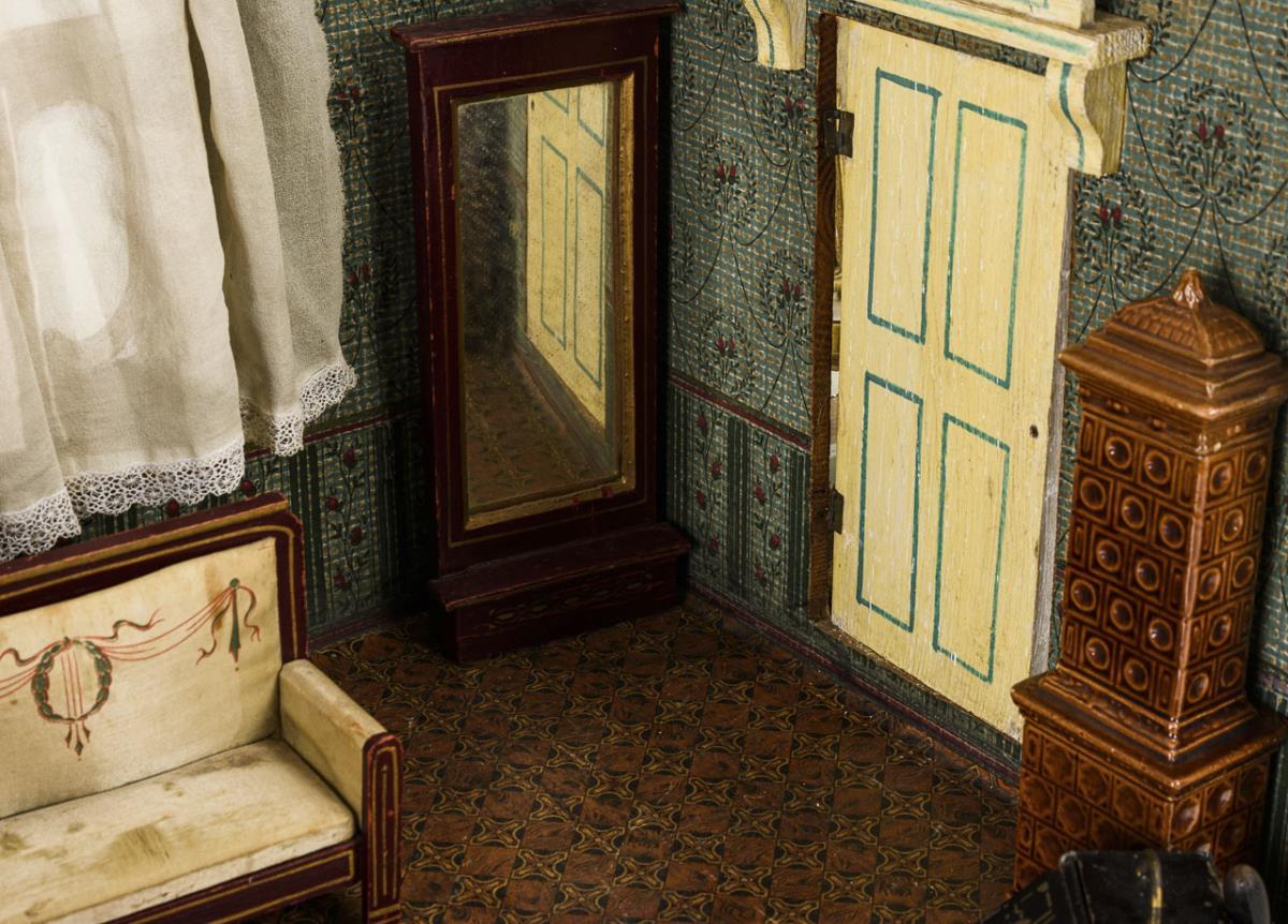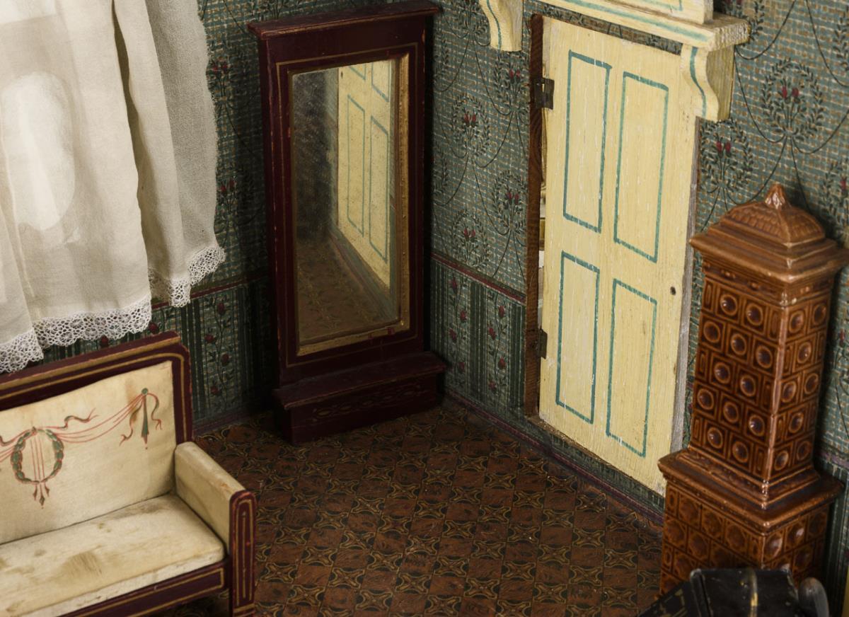 2-Raum-Gehäuse mit kleinem Podest, Zwischentür und 3 verglasten Flügelfenstern mit originalen Zinngriffen. Eingerichtet als Stube mit 5 Jugendstil-Möbelchen, Keramikofen, Blechtisch etc. und als Schlafzimmer mit Metallbett sowie Ofen, Waschtisch und Badewanne aus Blech. Bespielt, Altersspuren, Tapeten mit Wasserschaden.