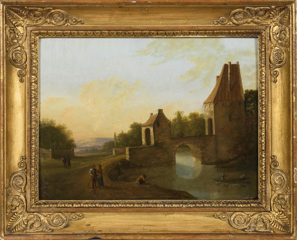 Flusslandschaft mit Brückenhaus und Staffagefiguren unter weitem abendlichem Himmel. Leichte Altersspuren.