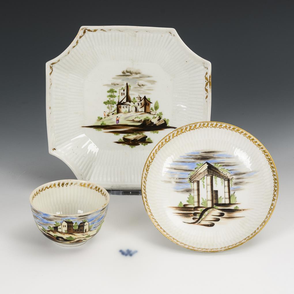 Gebrochen gerippte Form. Tasse (H 4,5 cm), Untertasse (Ø 13,5 cm) und Quadratschale (17 x 17 cm) mit Landschaftsmalerei. Gold partiell berieben.