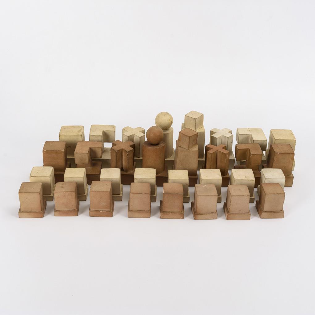 Vollständiger Satz Spielfiguren des Modells VII der von Josef Hartwig entwickelten Figuren. Die Verarbeitung lässt auf eine Versuchsserie schließen. Alters- und Gebrauchsspuren. Eine Kugel lose, einige Haarrisse und Chips, vereinzelt Klebestellen.