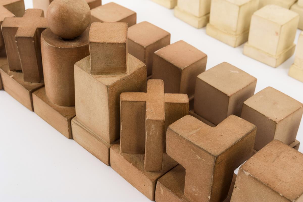 Große Schachfiguren in der Form des Bauhaus-Schachspieles.