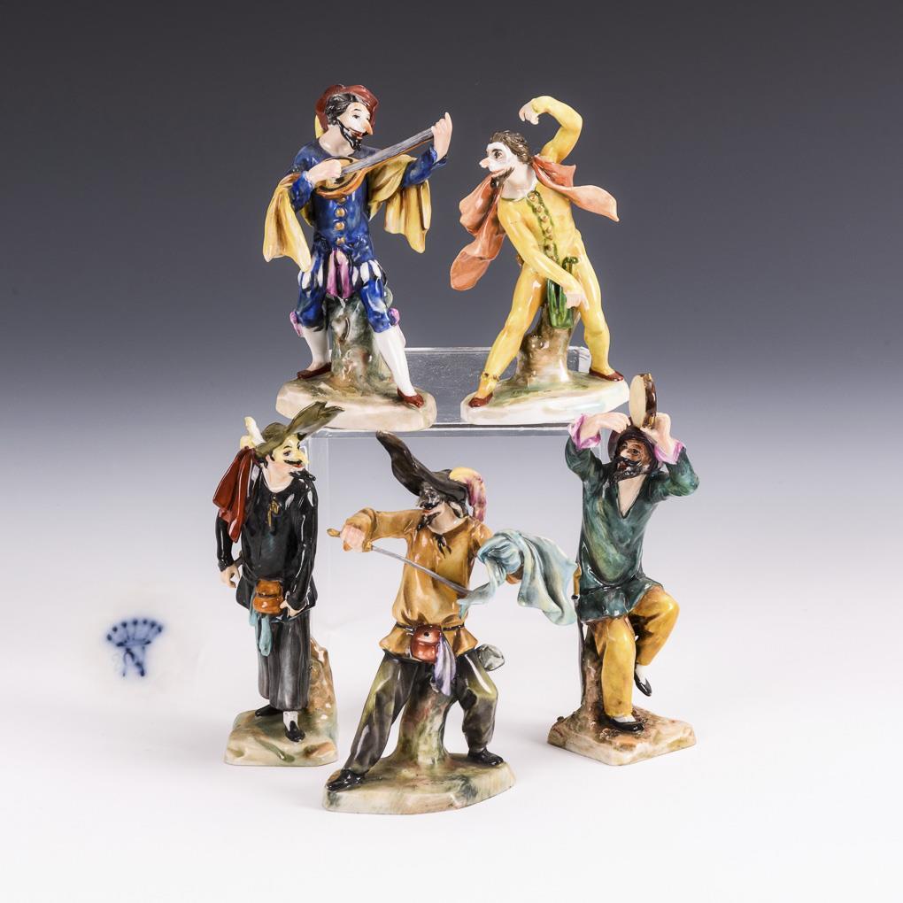 Karnevalistisch gekleidete Männer, u. a. mit Tamburin, Mandoline, Säbel. 1x Arm geklebt und Nase bestoßen, Mandolinenkopf fehlt, Glasurabplatzer an 1 Hut.