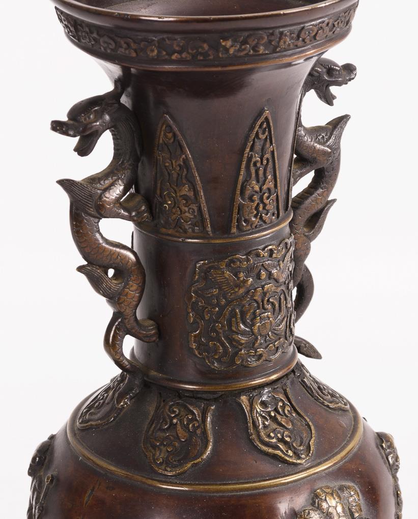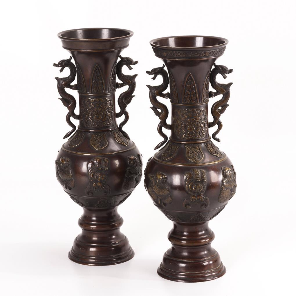 Identisches Paar in schlanker Form mit figürlicher Reliefdarstellung. Drachenhandhaben.