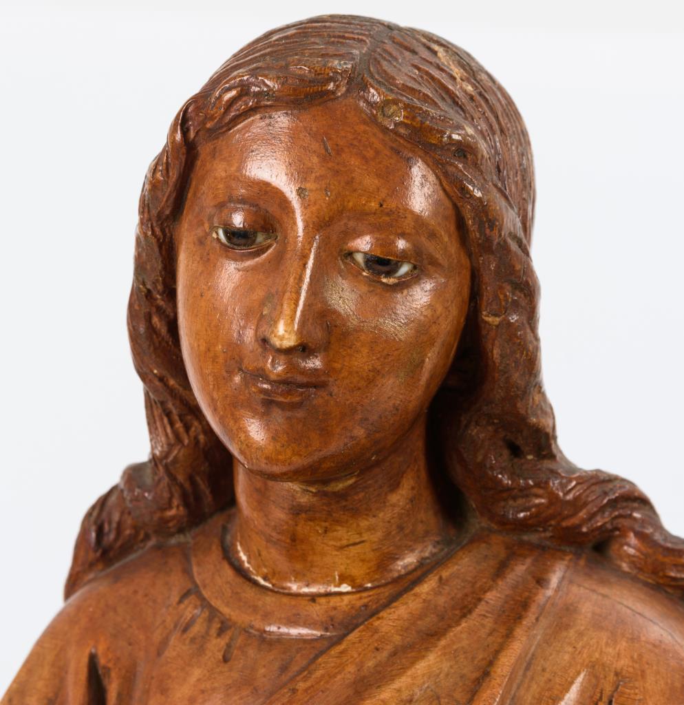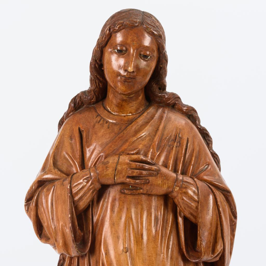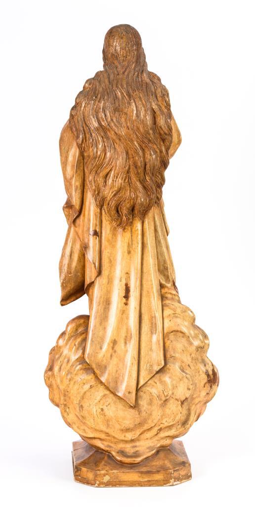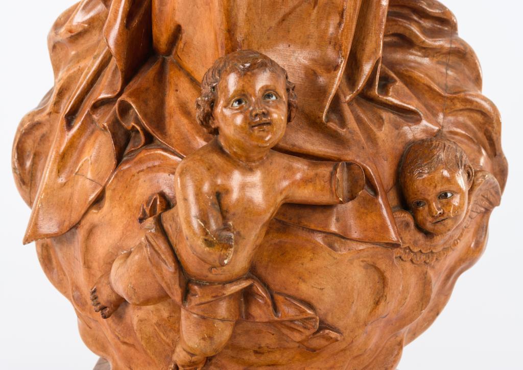Vollplastisch gearbeitete Standfigur der Jungfrau Maria, die auf Wolken mit Putten steht. Beide Unterarme eines Puttos fehlen, einige Trockenrisse, wenige Auskittungen, kaum Fehlstellen.