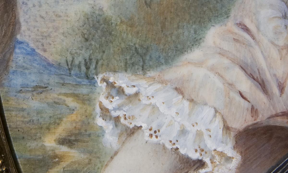 Sehr fein gemaltes Halbbildnis. Undeutlich signiert. Verglaster Messingrahmen mit Samt-Rückwand.