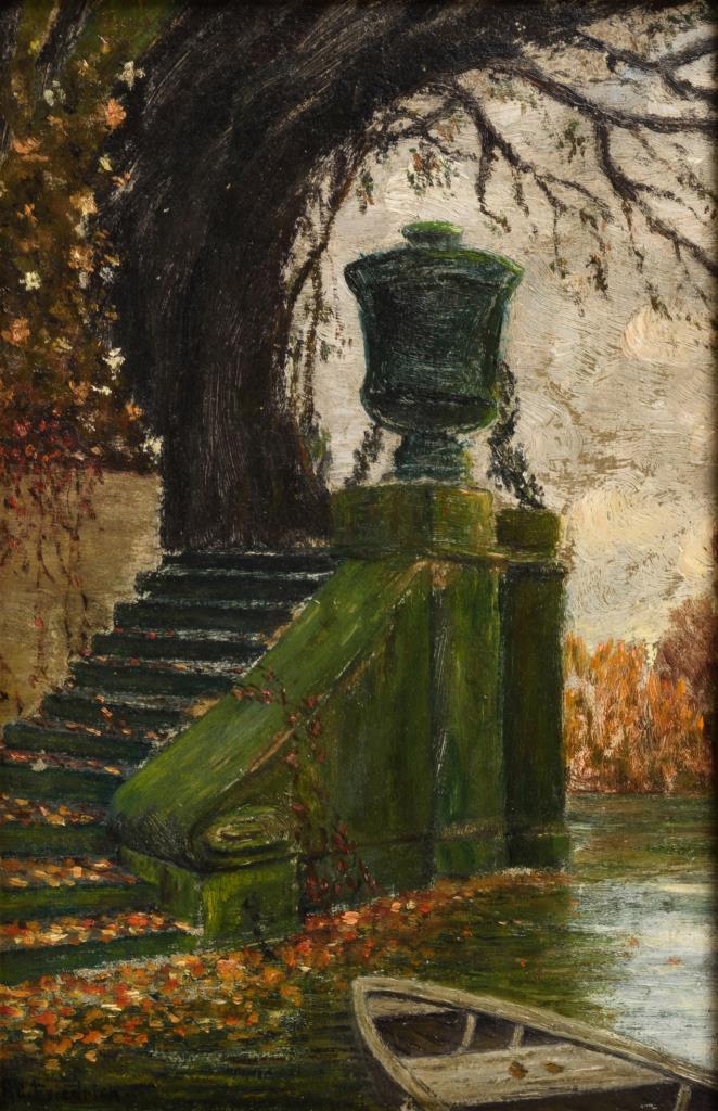 Verlassener Kahn an Steintreppe unter herbstlichen Bäumen.