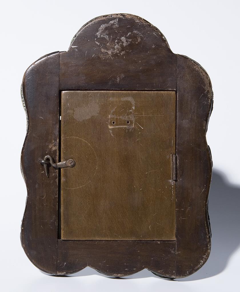 Kyrillisch beschriftet. Holzrahmen mit ornamental getriebenem Silber-Beschlag. Ohne Punzen, mit Säure geprüft.