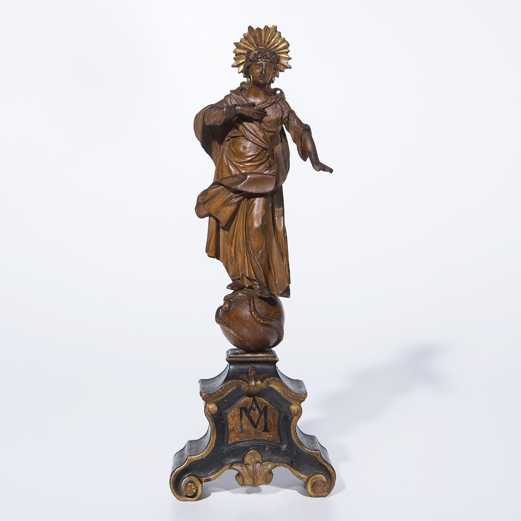 Vollplastische Standfigur. Auf der Erdkugel, um die sich eine Schlange mit Apfel windet stehende Maria, in einen frei ausschwingenden Mantel gehüllt. Die rechte Hand an die Brust gelegt, auf dem Haar ein Blütenkranz. Hoher geschweifter Volutensockel mit Marienmonogramm, partiell geschwärzt. Ein Arm, Strahlenkranz geklebt, eine Blüte, Finger einer Hand bestoßen.