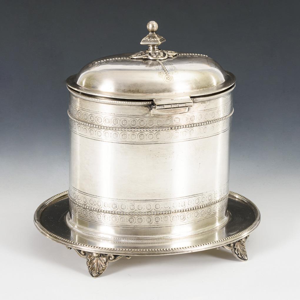 Metall, versilbert. 21 x 21,5 x 18 cm.