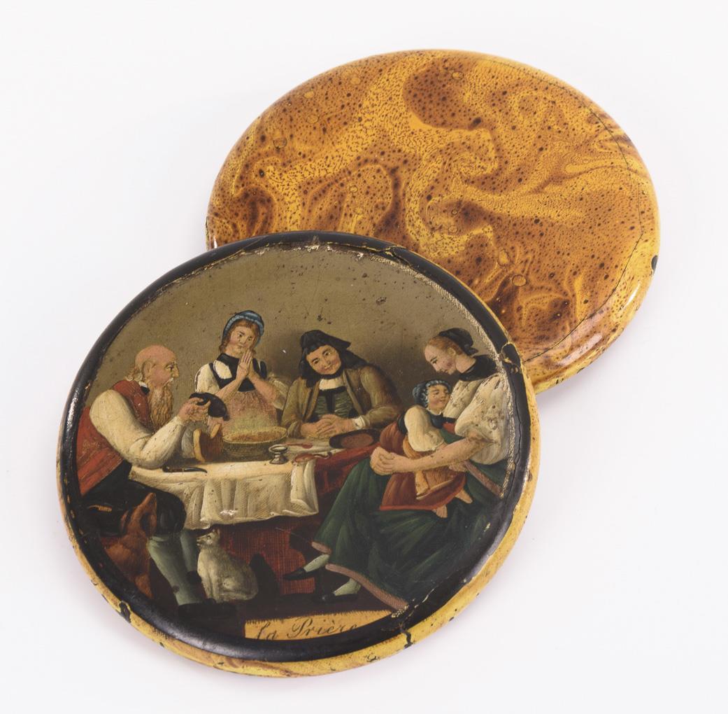 Runde Dose mit gemalter Marmorierung in Ockertönen; Passdeckel mit Familie am Tisch ("la Prière" betitelt). Klebespuren und geringe Fehlstellen am Rand, Alters-/Gebrauchsspuren.
