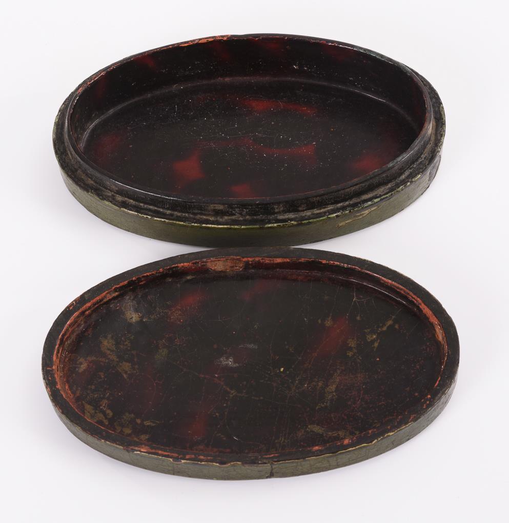 Ovale Dose; auf dem Passdeckel Reiterschlacht zwischen Husaren und Türken (Schlacht am Kahlenberg 1683?). Alters-/Gebrauchsspuren.