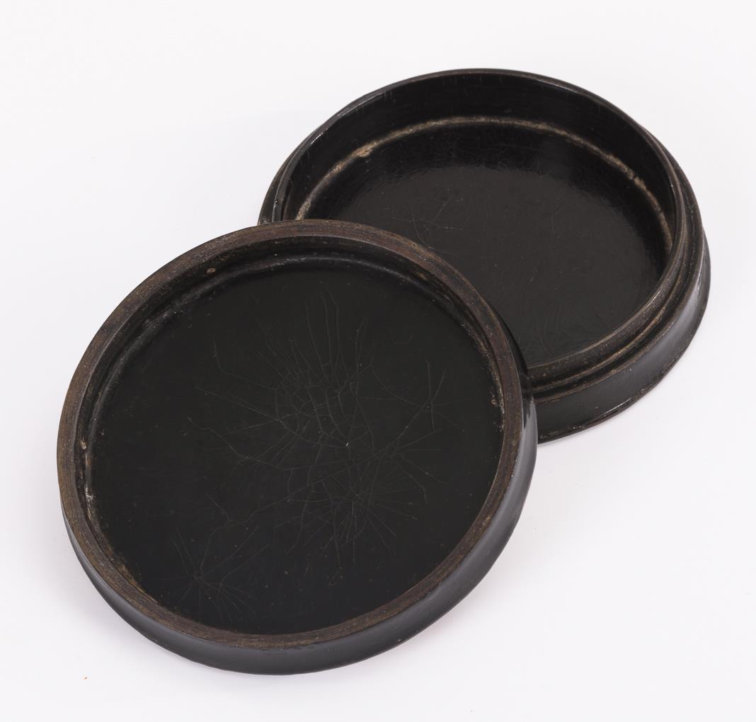 Papiermaché schwarz lackiert, Deckel-Lithografie mit Titel "Flamands en goguettes". H 2 cm, Ø 7,5 cm.