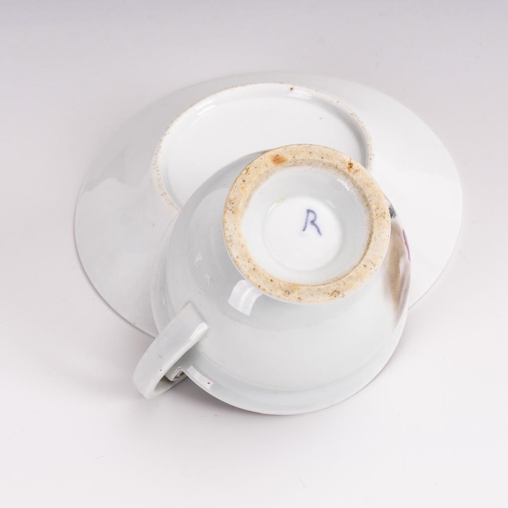 Polychrom bemalt, goldstaffiert. H Tasse 18 cm, Ø ergänzte Untertasse 13 cm.