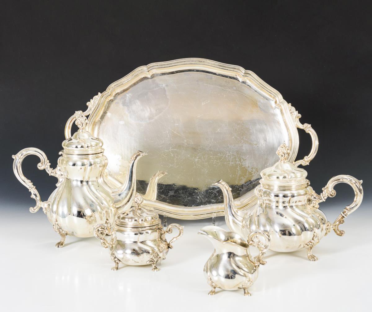 Godronierte Form: 2 Kannen, Zuckerdose und Sahnegießer. Auf passend ergänztem Tablett. Gebrauchsspuren.
