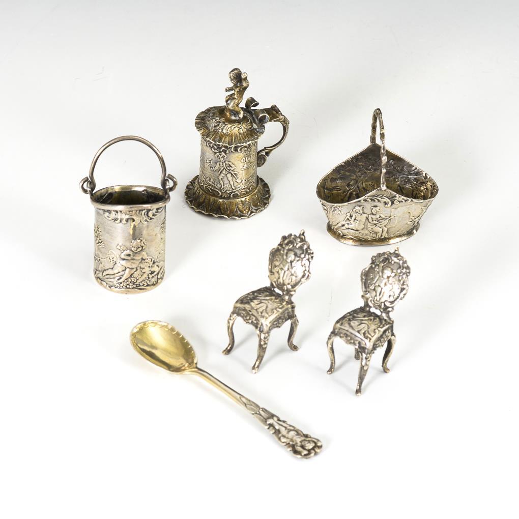 Eimer, Korb, Deckelkrug, Löffelchen und 2 Miniatur-Stühle. Henkelkorb mit kleinen Lötstellen.
